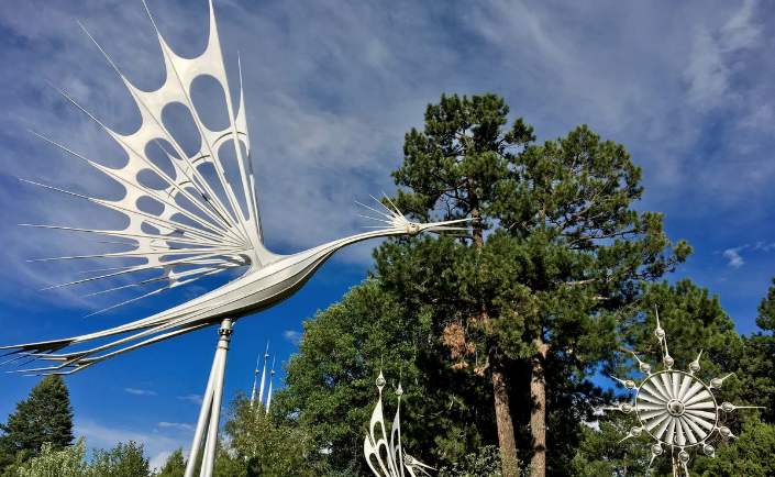Elaborate steel wind sculptures (30-50 feet tall) created by artist Starr Kempf (1917-1995) in his residential front yard. Some power spotlights, one triggers music. Bird and weather vane forms spin with mountain winds. Three sculptures moved to Creekwalk park. Requires insider knowledge to find.