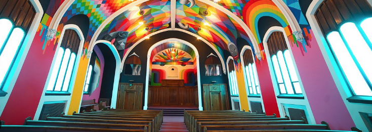 In 2017, the same year recreational cannabis became legal in Colorado, a group called the Elevationists bought a 113-year-old Lutheran church in a quiet Denver neighborhood and did something unprecedented: they turned it into a legal place of worship where cannabis is the sacrament. The neighbors were not thrilled. But the real revelation is the interior. The Elevationists commissioned Spanish artist Okuda San Miguel to transform the sanctuary, and he covered every surface with his signature geometric psychedelia: rainbow-colored deities, anthropomorphic birds, ancestral eagles, eyes filled with night stars, all rendered in Day-Glo colors that vibrate even when you're sober. The stained glass windows are now kaleidoscopic explosions. The altar is a portal. The effect is somewhere between a fever dream and a cathedral. The church hosts "BEYOND," an hourly 38-minute immersive laser light show with surround sound that visitors describe as transcendent whether or not they partake in the sacrament. You don't have to consume cannabis to visit (and you can't buy it there), but you might leave questioning a few things regardless.