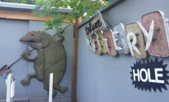 Artists Mike Wellins and Lisa Freeman planned to open a food truck in 2010. They pivoted to cryptozoology instead. The Peculiarium opened April 2011 with a 10-foot Bigfoot, alien autopsy exhibits, and walls hung with thrift-store landscapes that Wellins "improved" by painting in zombies, space monsters, and giant robots—a technique he calls NERC (Non-Elective Retroactive Collaboration). Closed 17 months during the pandemic, reopened July 2021, still selling jetpack bunnies and machine gun Bigfoot art.